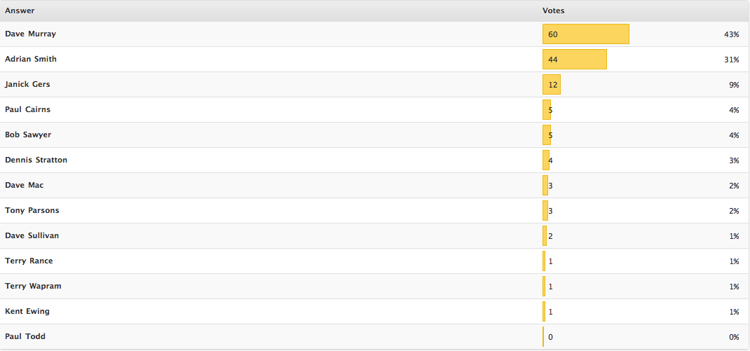Tirando os 3 atuais da banda, acredito que Dennis Stratton seja o mais conhecido de quem estudou a banda. E aí, mais uma surpresa: na certeza que ele teria o quarto lugar garantido na pesquisa, Paul Cairns e Bob Sawyer (aquele que sempre queria se destacar perante Murray nos primórdios da banda) o venceram pela contagem mínima. Mas venceram.