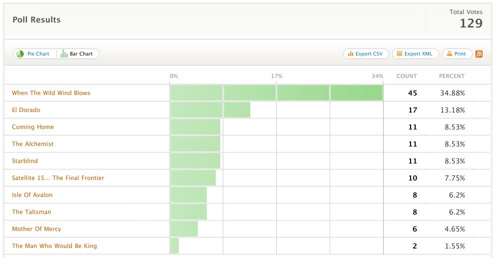 E, por fim, algo que desta vez não me surpreende, a “The Man Who Would Be King” recebeu a menor quantidade de votos (menos de 2%). Talvez me surpreenda que ela tenha chegado a ser lembrada por duas pessoas, visto que a música é, de longe, a mais fraca do disco. Fico a disposição dos que escolheram essa música como preferida para discuti-la, visto que realmente não consegui ainda ver nada nela…