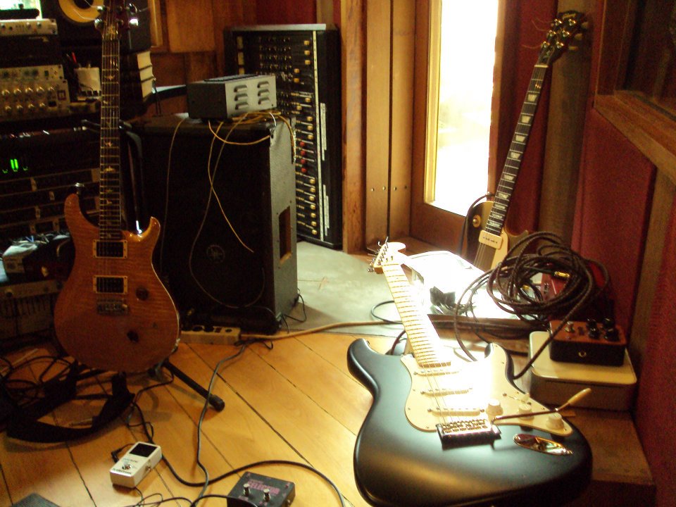 Mais à frente, A Fender Stratocaster. Ao lado esquerdo, a inseparável PRS de Cheese. Lá no fundo, a Les Paul com os P-90.