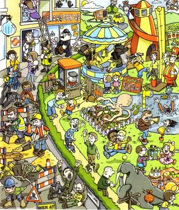 Ainda tem bastante coisa pendente! Na figura 1, por exemplo, não consegui identificar o que significa os patinhos na lagoa e o menininho e a menininha emburrada em frente ao carrossel. Na 2, os três ratinhos com boné, a moça loira tomando chá, entre tantos outros.