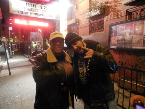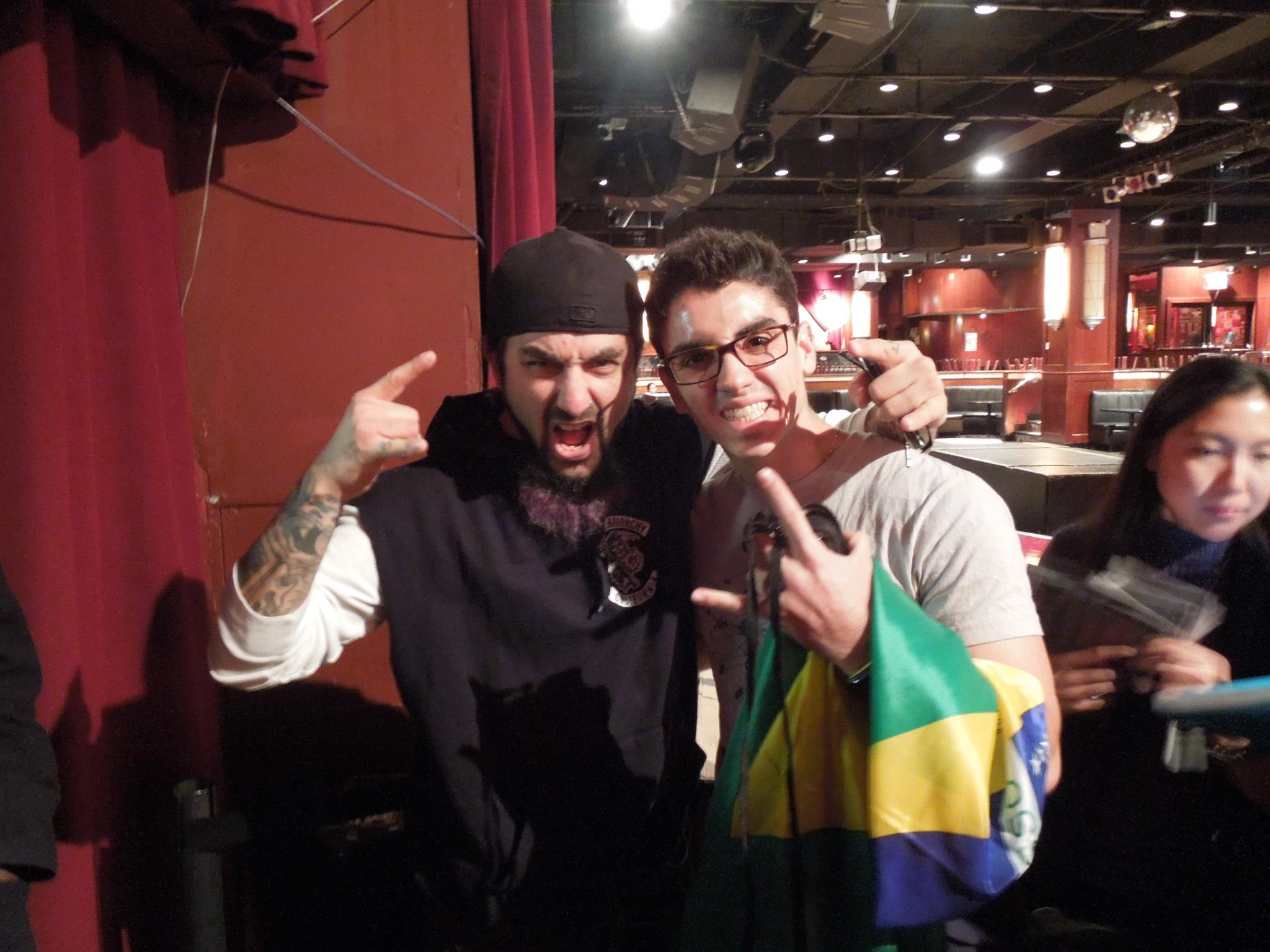 O placar da noite é o seguinte: dois cds (um sem capa), casaco de “ovelha heavy metal”, máquina fotográfica e pilhas gastas. Sozinho, preciso usar o expertise carioca para entender o que farei após o fim do show. Volto a ser um estranho no ninho, meio puto por estar sem meu kit completo que levei até ali. “Acho” um grupo de brasileiros, trocamos algumas informações. Havia inclusive um casal paulista que estava pela primeira vez em NY e que não sabia voltar para o hotel. Para eles, uma dupla de estudantes (entre 18 e 21 anos) dão as dicas. Eles retornarão ao Brasil no final do ano após um período de estudos nos Estados Unidos. O mais novo, Vinicius Bazan, estuda na Polytechnic Institute of New York City. É fã de Portnoy. Semanas antes estivera em outra apresentação do músico, também em Nova Iorque, com quem tirara uma foto MUITO legal. Dá uma olhada.