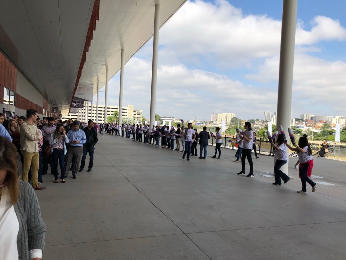 O evento ainda não está aberto. Há muita gente já tentando acessar o local, tanto que as 10h15, gritaram aqui para organizarem uma fila. Eu, que cheguei cedo mas estava mais afastado, cheguei na fila com cerca umas 100 pessoas já na frente. Haverá um credenciamento para quem comprou o ingresso pela internet antes da entrada.