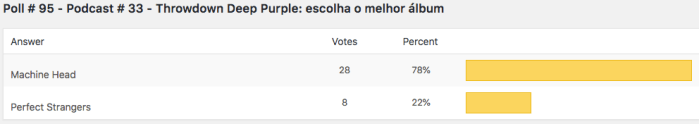 Sobre a lição de casa, dado o número de participantes, optamos por deixar a análise do álbum do Glenn Hughes e Inglorious acumulada para a próxima edição. Já o throwdown da vez, do Deep Purple, foi conferido ficou assim: Machine Head 4 x 0 Perfect Strangers. Sim, uma lavada completa, mas com direito a comentários bastante elogiosos a este excelente álbum que, no confronto, foi derrotado.