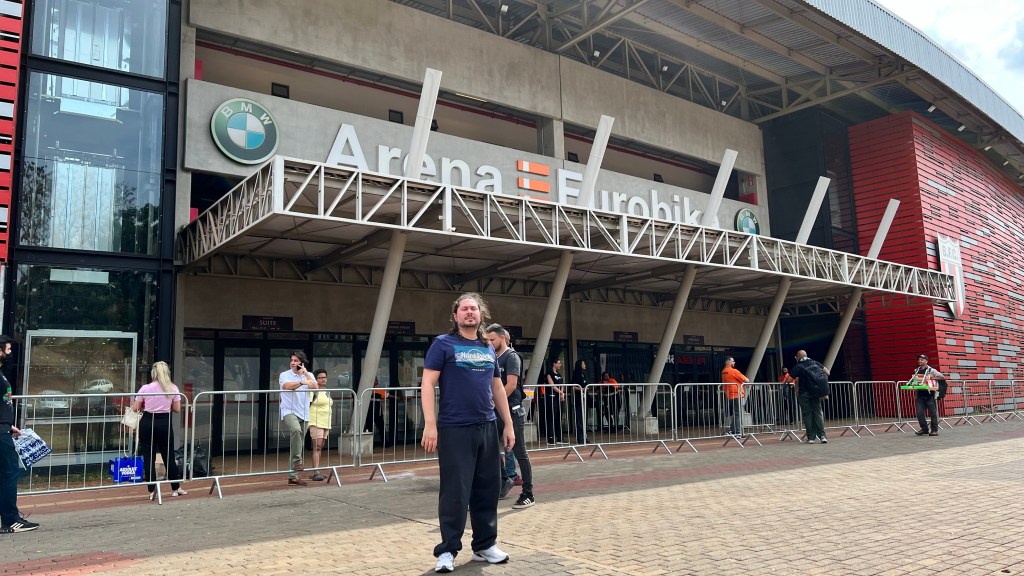 19h00 – já estamos do lado de dentro. Do lado de fora, zero clima de show na principal avenida. Só quando da chegada na rua do estádio que o clima deu uma melhorada. Chegamos bem cedo e a entrada foi tranquilíssima. “Toquei” Flight of Icarus em uma bateria de uma campanha promocional e tiramos foto no painel. O palco não foi montado no estádio em um dos gols, como de costume, priorizando o meio de campo onde as arquibancadas do estádio são maiores. Replicaram algumas caixas de som para a galera da arquibancada, o que é boa notícia para a galera que estará mais longe. Na PA, Led com Rock and Roll.