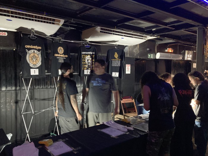 Com abertura da casa às 17:00 e fim do evento previsto para 20:00 (afinal, o metal nosso de cada dia não pode atrapalhar o pagode do paulistano), pisei no Carioca Club às 17:40, assumindo que a apresentação começaria 18:00. Deu tempo de sobra para passar na lojinha. Todo o material veio da própria banda e todos os LPs e CDs estavam autografados (LPs custavam R$ 130,00 e CDs custavam R$ 120,00 – vi gente reclamando que o valor era alto, mas era material importado da Inglaterra e autografado; estava era de graça, isso sim). Me chamou a atenção que havia muito mais discos que CDs (nas fotos do slide show eu tirei uma foto do estoque de discos trazido pela banda), até porque quando eu comprei o único CD que tinha (o último ao vivo em Tel Aviv – A Heaven You May Create), o carinha da loja me avisara que eu estava comprando o penúltimo (e tinha umas 50 pessoas naquela hora dentro do local).