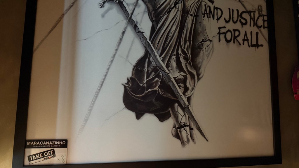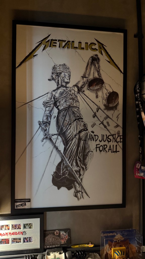 Inicialmente, achei este local para exibir o ingresso no canto de casa que escuto música e tenho toda a minha “tralha” de souvenirs, discos, etc. O maior quadro que tenho ali é justamente do …And Justice For All, e ali ele está.