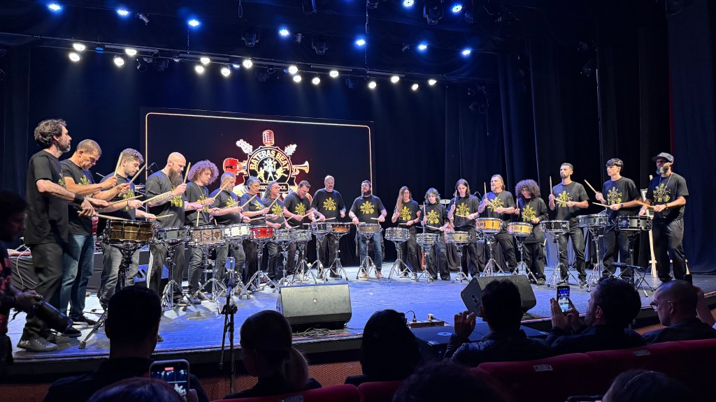 A abertura do evento contou com 20 bateristas nas caixas para o Paradiddles Beat. Quem liderou e “puxou” os outros 19 foi o excepcional Alan Marques, baterista consagrado do Brasil, ex-Sangrena (death metal), meu professor e também um grande amigo. Alan, assim, representou a franquia da Vila Mariana e a escola / unidade paulistana com a maestria que já lhe é conhecida. Fabio, um dos alunos e que também esteve “no meu evento” alguns dias depois, também representou muito bem a escola no palco…