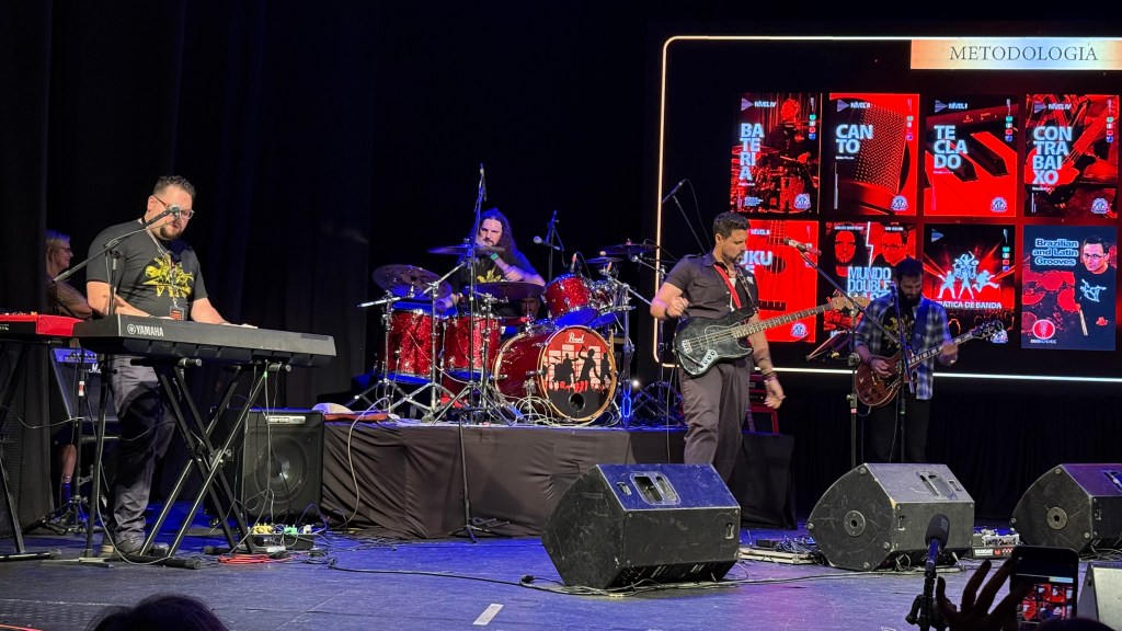 Homenagem póstuma a Dudu Portes feita, a metodologia Kids da escola foi trazida por Xande Tamietti, co-fundador do Pato Fu e homenageando a maior unidade da marca que, ao contrário do que muitos (inclusive eu) poderia pensar, não fica em São Paulo: Cuiabá tem o título com duas franquias na cidade. Xande trouxe versão de Live And Let Die e outros clássicos em um pequeno kit infantil, tirando um som surreal dali. Algo bem diferente de se presenciar – inicialmente, confesso que torci um pouco o nariz, mas na sequência achei interessante o que fizeram. O evento seguiu com alunos e professores de violão tocando Used To Love Her e um momento aos patrocinadores do evento e do BB.
