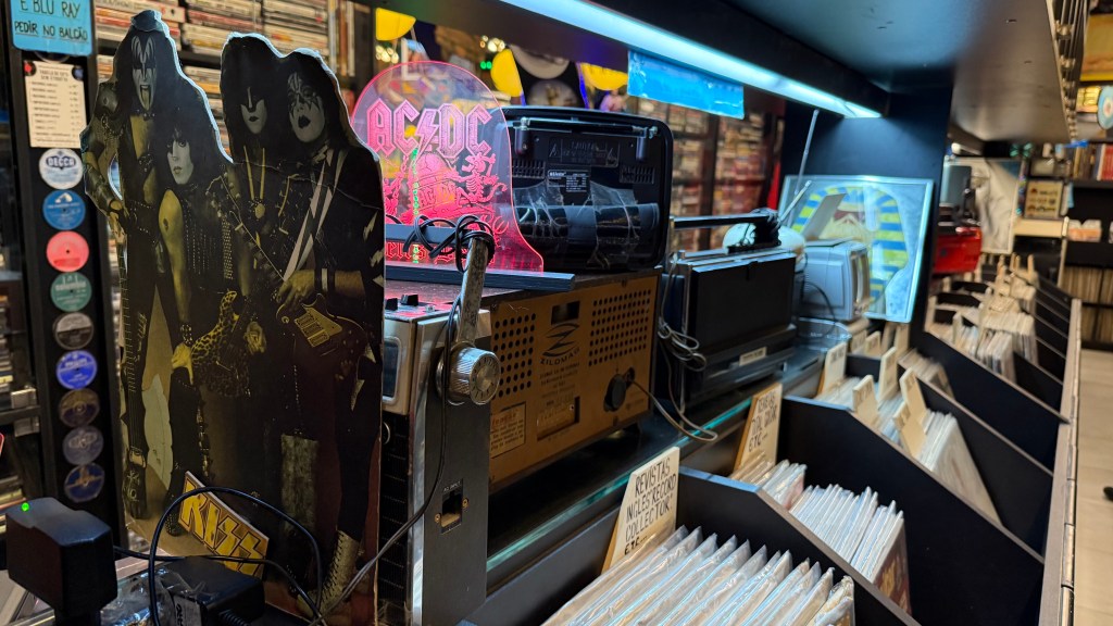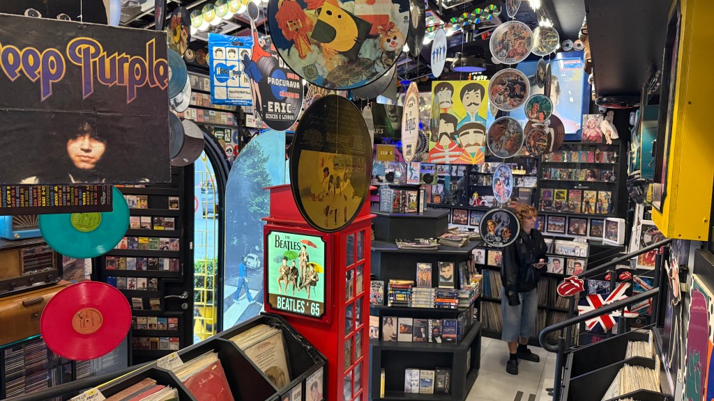 Apesar do vinil ainda ser um dos carros-chefe, a loja possui praticamente tudo que você pode imaginar de mídias físicas, incluindo VHS, K-7s, laser discs (!) e, claro, CDs a dar com pau. Além disso, há revistas, livros, fotos, pôsteres, action figures… um verdadeiro acervo de diferentes souvenirs. Além disso, o andar de cima funciona como um estoque, mas ainda tem coisas da “Eric Livros”. Em resumo: tem de tudo.
