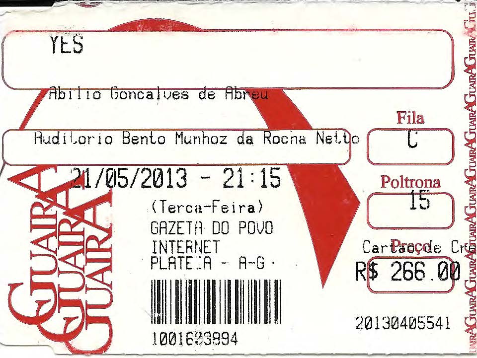 ‘2013.05.21 – Yes – Teatro Guaíra – Curitiba’ Publicado quinta-feira, novembro 20th, 2014 at 960 × 721 em Galeria de Ingressos – ano: 2013 Yes – Curitiba ‹ Voltar
